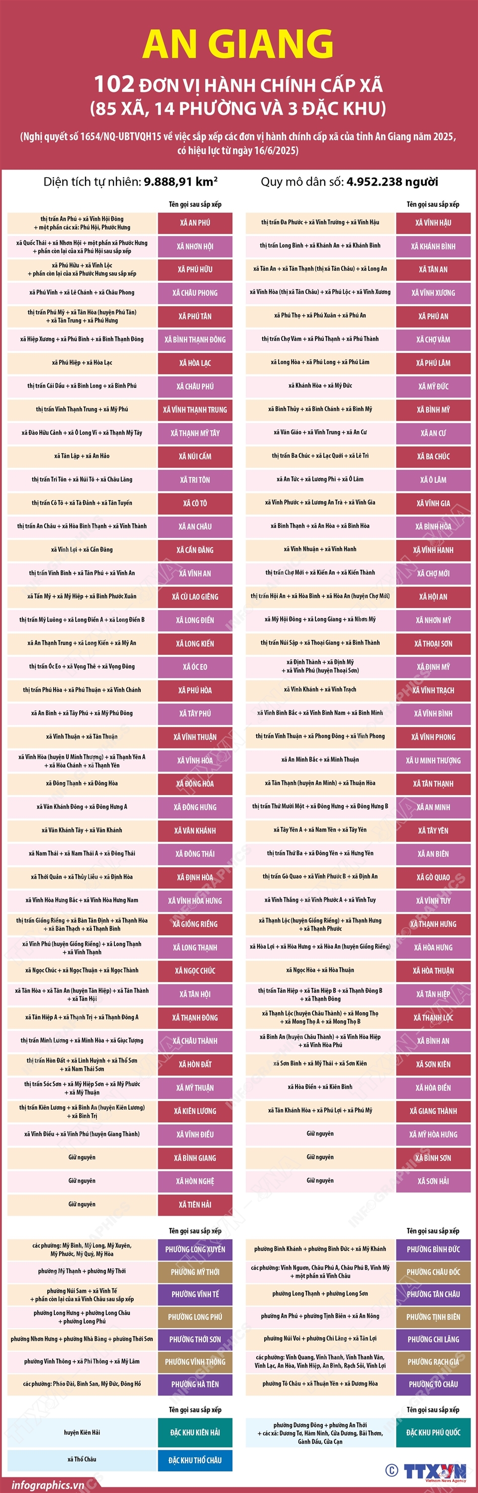 Hà Nội (TTXVN 2/7) Theo Nghị quyết số 1654/NQ-UBTVQH15 ngày 16/6/2025 của Ủy ban Thường vụ Quốc hội, sau khi sắp xếp, tỉnh An Giang có 102 đơn vị hành chính cấp xã, gồm 85 xã, 14 phường và 03 đặc khu; trong đó có 79 xã, 14 phường, 03 đặc khu hình thành sau sắp xếp quy định tại Điều này và 06 xã không thực hiện sắp xếp là các xã Mỹ Hòa Hưng, Bình Giang, Bình Sơn, Hòn Nghệ, Sơn Hải, Tiên Hải.