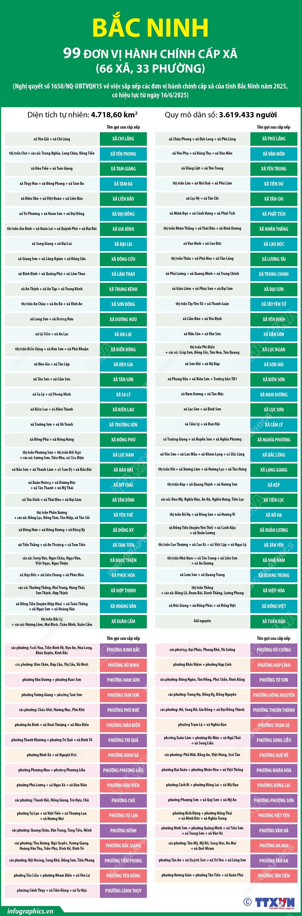 Hà Nội (TTXVN 27/6) Theo Nghị quyết số 1658/NQ-UBTVQH15 ngày 16/6/2025 của Ủy ban Thường vụ Quốc hội, sau khi sắp xếp, tỉnh Bắc Ninh có 99 đơn vị hành chính cấp xã, gồm 66 xã và 33 phường; trong đó có 65 xã, 33 phường hình thành sau sắp xếp quy định tại Điều này và 01 xã không thực hiện sắp xếp là xã Tuấn Đạo.