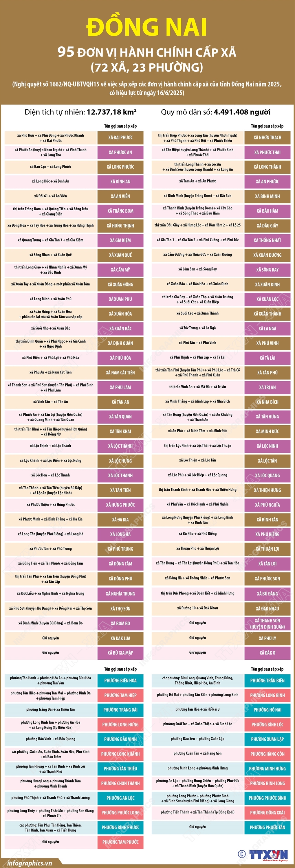 Hà Nội (TTXVN 27/6) Theo Nghị quyết số 1662/NQ-UBTVQH15 ngày 16/6/2025 của Ủy ban Thường vụ Quốc hội, sau khi sắp xếp, tỉnh Đồng Nai có 95 đơn vị hành chính cấp xã, gồm 72 xã và 23 phường; trong đó có 67 xã, 21 phường hình thành sau sắp xếp quy định tại Điều này và 07 đơn vị hành chính cấp xã không thực hiện sắp xếp là phường Phước Tân, phường Tam Phước, các xã Thanh Sơn (huyện Định Quán), Đak Lua, Phú Lý, Bù Gia Mập, Đăk Ơ.