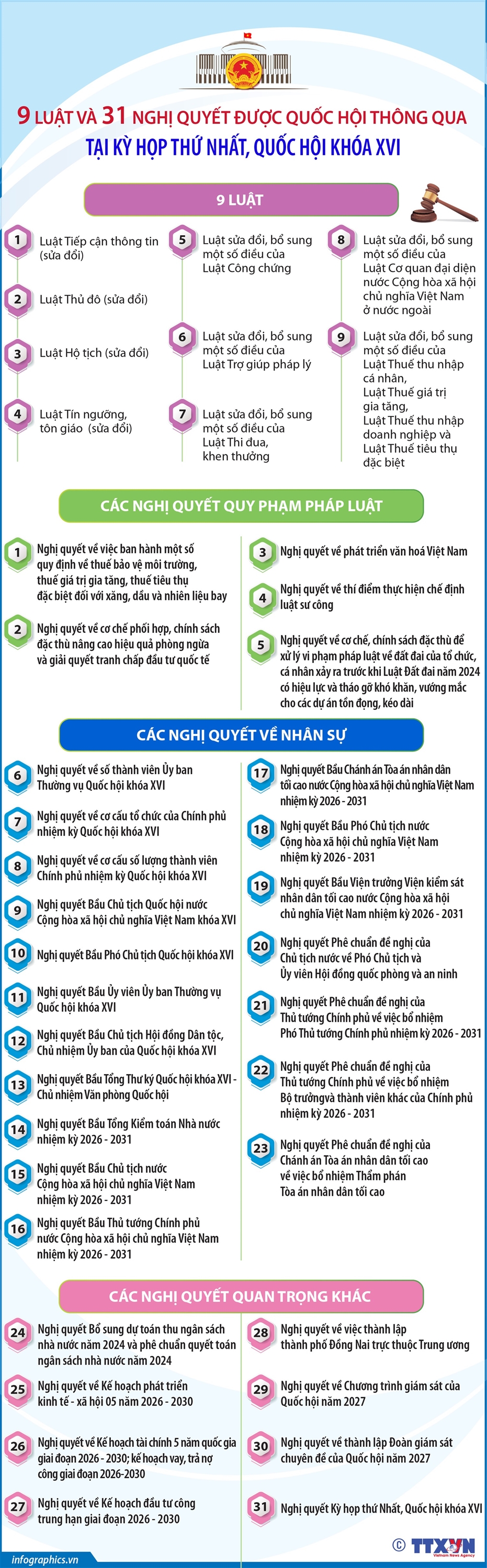 Thông tin về 9 luật và 31 nghị quyết được Quốc hội thông qua tại Kỳ họp thứ nhất, Quốc hội khóa XVI