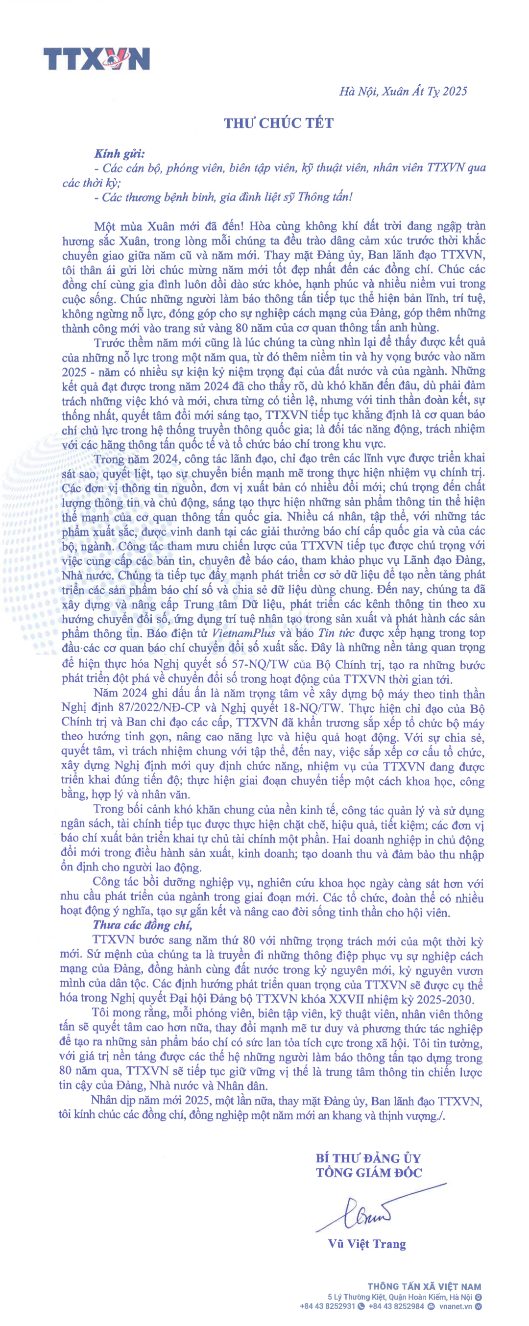 Nhân dịp Tết nguyên đán Ất Tỵ 2025, Tổng giám đốc Thông tấn xã Việt Nam (TTXVN) Vũ Việt Trang đã gửi thư chúc Tết đến toàn thể cán bộ, phóng viên, biên tập viên, kỹ thuật viên, công nhân viên TTXVN đang công tác và đã nghỉ hưu, các đồng chí thương bệnh binh, gia đình liệt sĩ Thông tấn.
