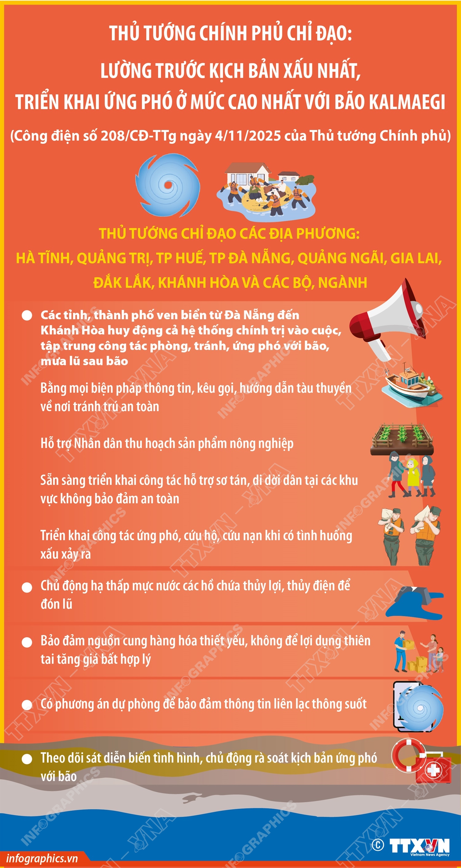 Hà Nội (TTXVN 4/11) Thủ tướng Chính phủ Phạm Minh Chính vừa ký Công điện số 208/CĐ-TTg ngày 4/11/2025 yêu cầu các bộ ngành, địa phương chủ động phòng, tránh, ứng phó với bão Kalmaegi. Công điện nêu: Đây là cơn bão cường độ rất mạnh, sau khi vào Biển Đông tiếp tục mạnh lên, phạm vi ảnh hưởng gió mạnh rất rộng. Khoảng từ tối hoặc đêm ngày 6/11/2025 bão có thể ảnh hưởng trực tiếp đến đất liền khu vực từ Đà Nẵng đến Khánh Hòa với sức gió mạnh nhất vùng gần tâm bão mạnh cấp 10-12, giật cấp 14-15, khu vực Tây Nguyên cũ cũng có thể xảy ra gió mạnh cấp 8-9, giật cấp 11; khu vực từ Hà Tĩnh đến Khánh Hòa có thể xảy ra đợt mưa to đến rất to. Để chủ động phòng, tránh, ứng phó với bão Kalmaegi và mưa lũ sau bão, Thủ tướng Chính phủ yêu cầu bằng mọi biện pháp thông tin, kêu gọi, hướng dẫn tàu thuyền về nơi tránh trú an toàn; Lưu ý đề phòng dông lốc, sét từ trước khi bão ảnh hưởng trực tiếp; Chủ động hạ thấp mực nước các hồ chứa thủy lợi, thủy điện để đón lũ; Triển khai phương tiện tại các khu vực trọng điểm để triển khai nhanh nhất công tác ứng phó, tìm kiếm cứu nạn khi có tình huống xấu xảy ra; Bảo đảm nguồn cung hàng hóa thiết yếu, không để lợi dụng thiên tai tăng giá bất hợp lý; Có phương án dự phòng để bảo đảm thông tin liên lạc thông suốt; Theo dõi sát diễn biến tình hình, chủ động rà soát kịch bản ứng phó với bão, không để bị động, bất ngờ trong mọi tình huống.