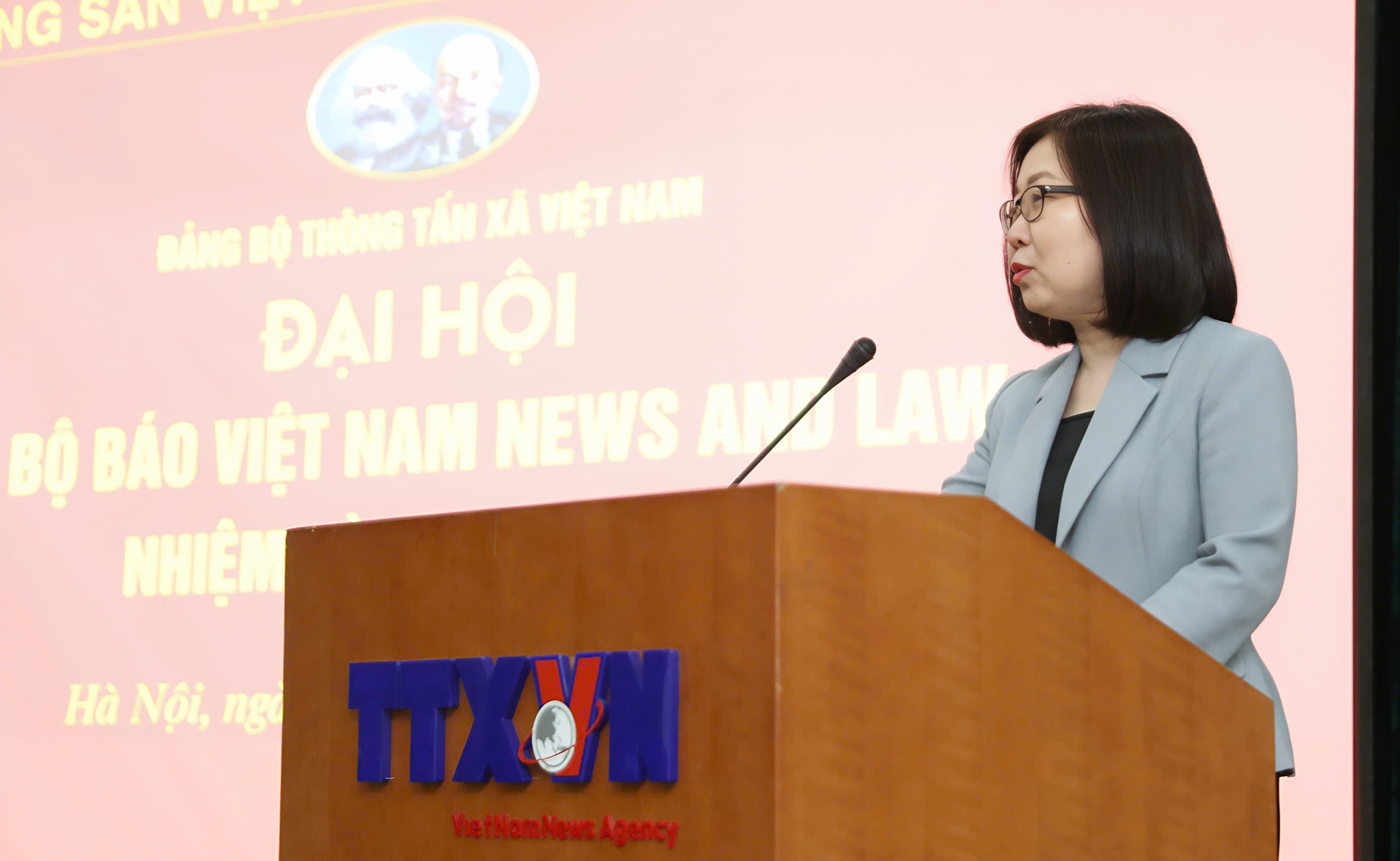 | Ủy viên Ban Thường vụ Đảng ủy, Phó tổng giám đốc TTXVN Đoàn Thị Tuyết Nhung phát biểu tại Đại hội Chi bộ báo Việt Nam News and Law nhiệm kỳ 2025-2030, ngày 27/5 |