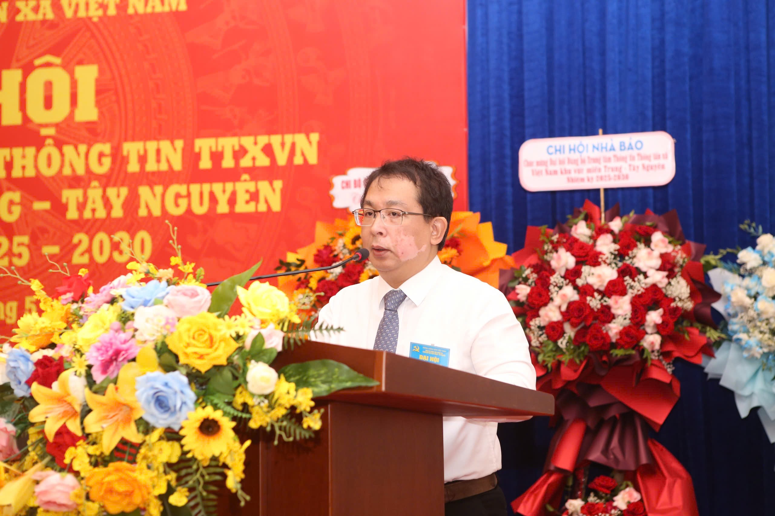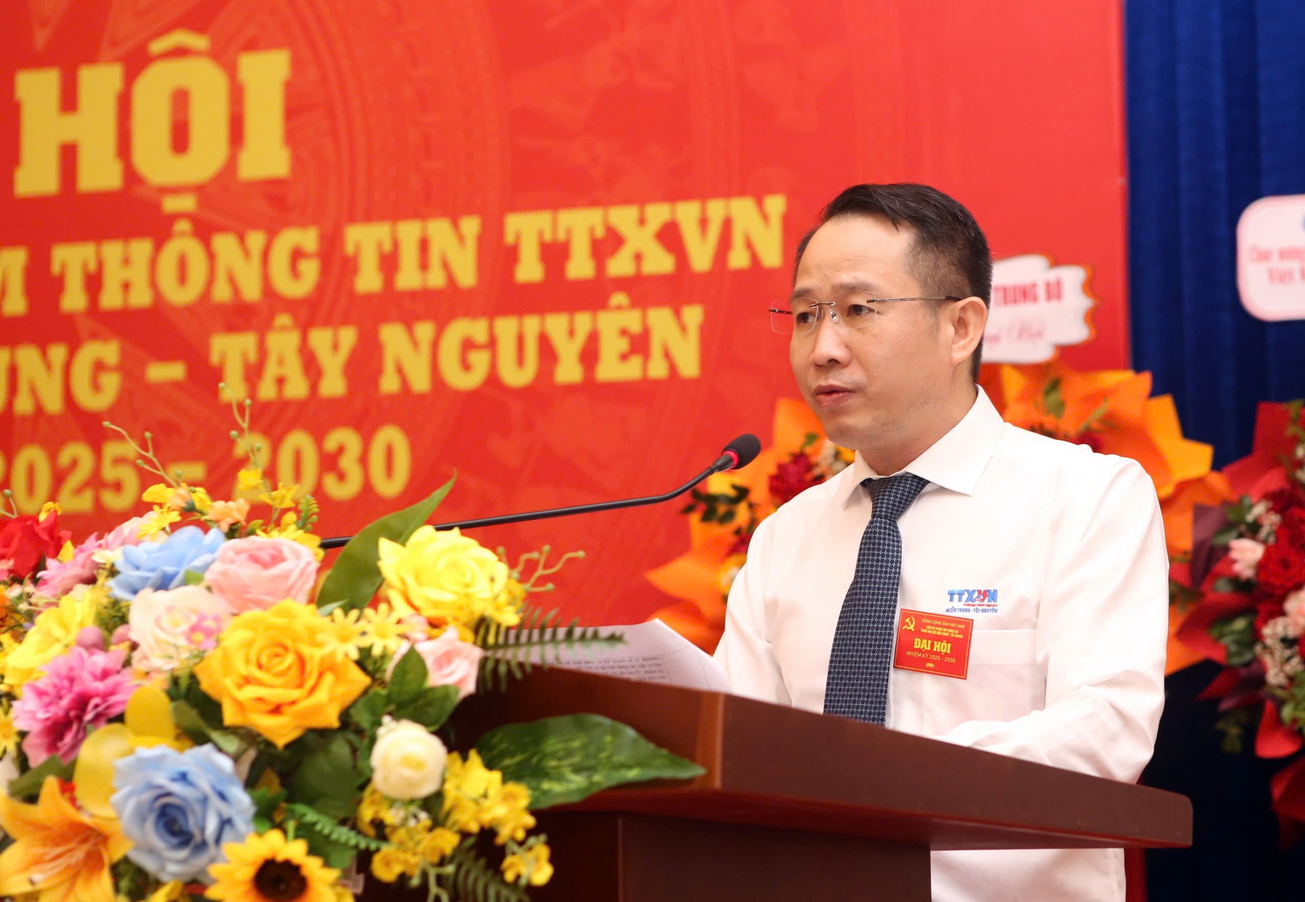 | Bí thư Đảng ủy, Giám đốc Trung tâm thông tin TTXVN khu vực MT-TN Nguyễn Việt Dũng phát biểu tại Đại hội Đảng bộ Trung tâm thông tin TTXVN khu vực MT-TN nhiệm kỳ 2025-2030, ngày 23/5 |