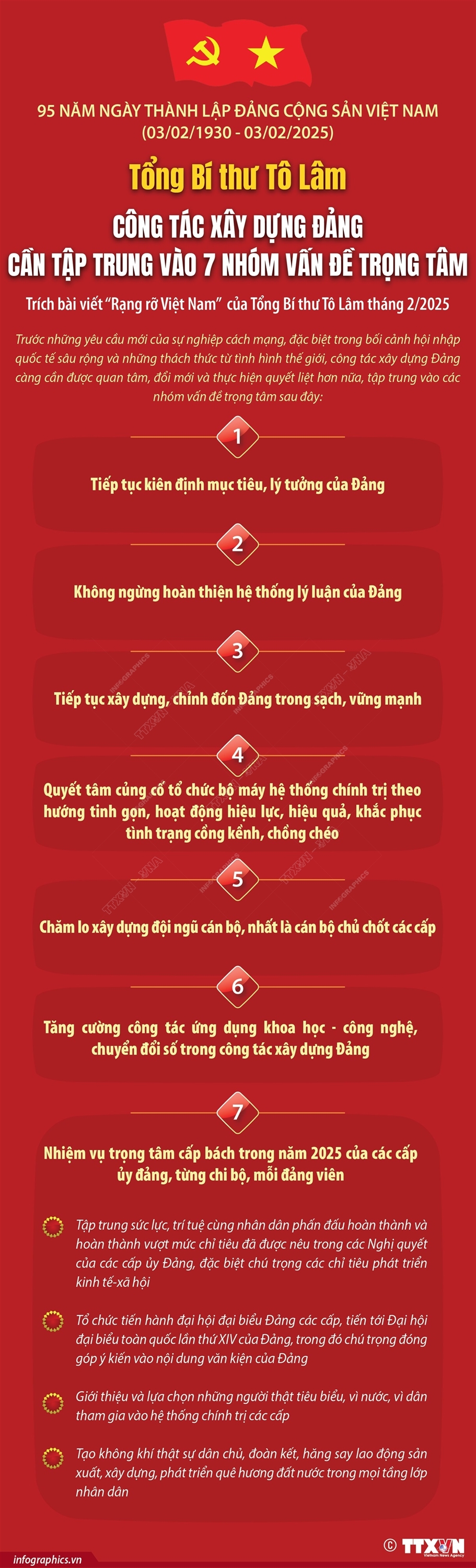 Nhân kỷ niệm 95 năm Ngày thành lập Đảng Cộng sản Việt Nam (03/02/1930 - 03/02/2025), Tổng Bí thư Tô Lâm đã có bài viết với tiêu đề "RẠNG RỠ VIỆT NAM". Trong bài viết, Tổng Bí thư khẳng định: Trước những yêu cầu mới của sự nghiệp cách mạng, đặc biệt trong bối cảnh hội nhập quốc tế sâu rộng và những thách thức từ tình hình thế giới, công tác xây dựng Đảng càng cần được quan tâm, đổi mới và thực hiện quyết liệt hơn nữa, tập trung vào các nhóm vấn đề trọng tâm: Tiếp tục kiên định mục tiêu, lý tưởng của Đảng, Không ngừng hoàn thiện hệ thống lý luận của Đảng, Tiếp tục xây dựng, chỉnh đốn Đảng trong sạch, vững mạnh…
