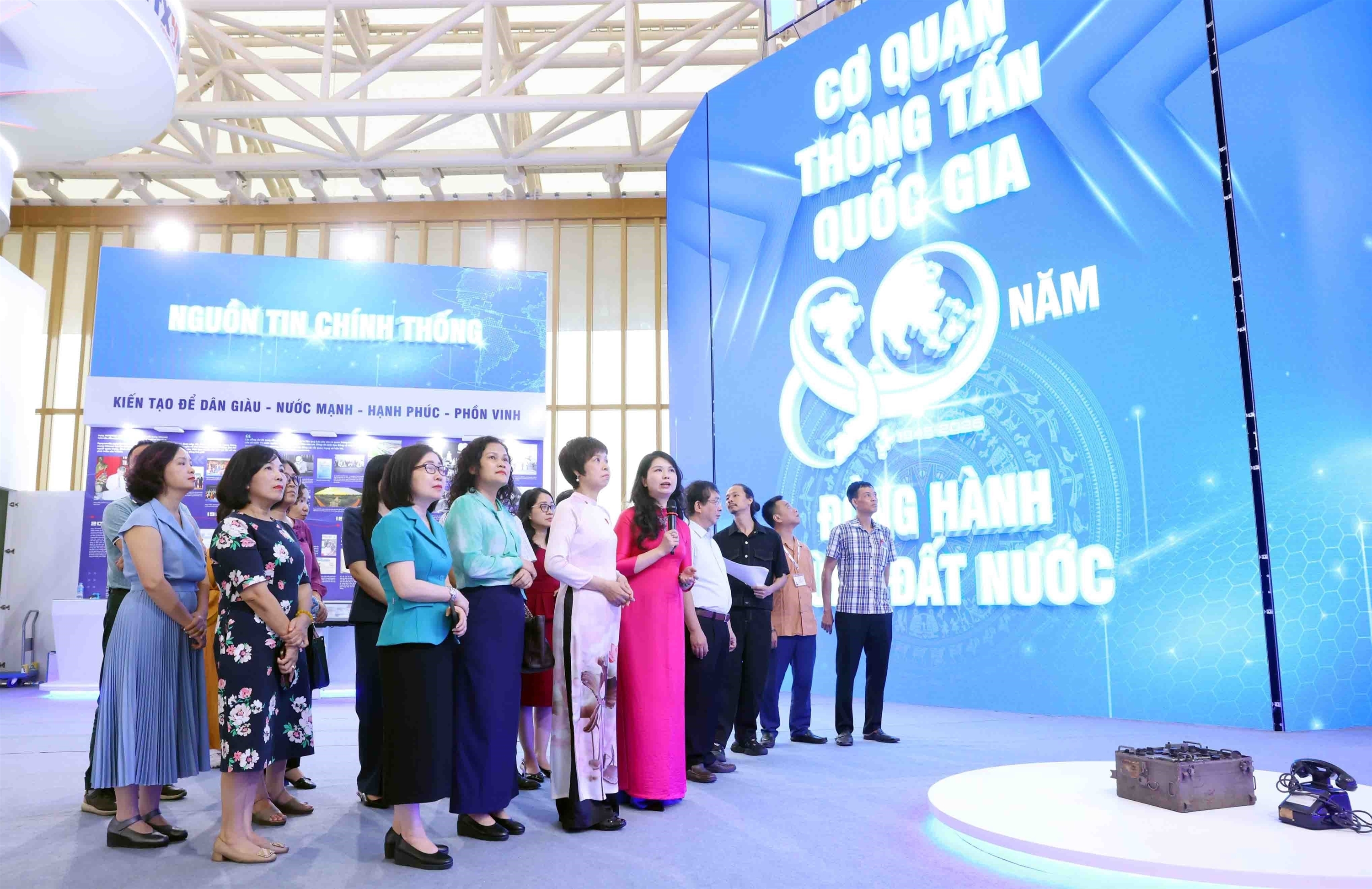Tổng giám đốc Vũ Việt Trang và các đại biểu tham dự tổng duyệt khu trưng bày của TTXVN tại Triển lãm thành tựu đất nước với chủ đề "80 năm Hành trình Độc lập-Tự do-Hạnh phúc", Trung tâm Triển lãm Quốc gia (Đông Anh, Hà Nội), ngày 24/8 |