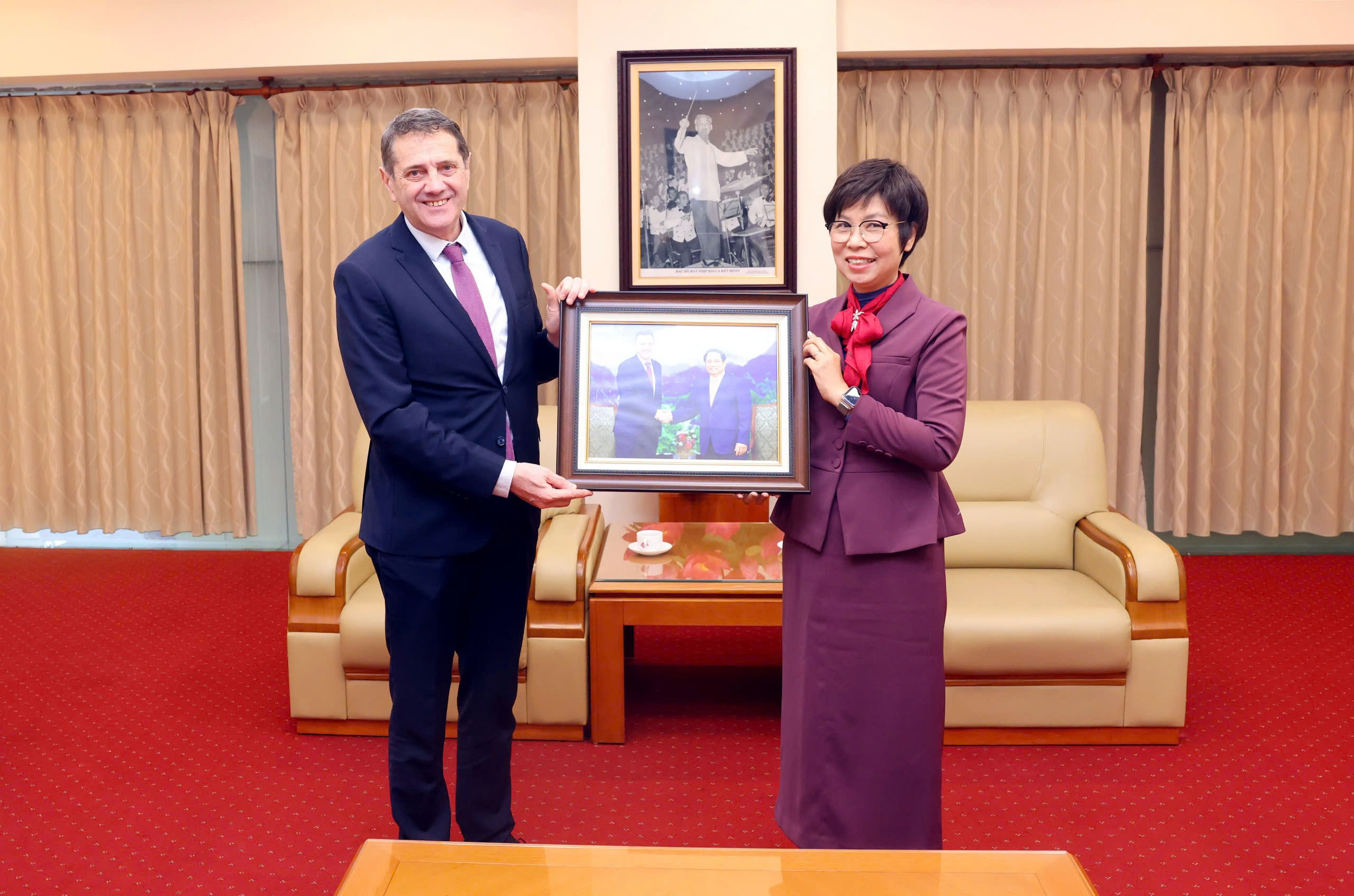 | Tổng giám đốc TTXVN Vũ Việt Trang tặng Đại sứ Bulgaria Pavlin Todorov bức ảnh lưu niệm tại Trung tâm Thông tấn quốc gia, Hà Nội, ngày 13/3 |