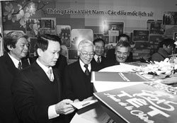 | Tổng Bí thư Nguyễn Phú Trọng thăm gian trưng bày của TTXVN tại Hội Báo Xuân Ất Mùi, ngày 7/2/2015 | TTXVN đã ký kết hơn 50 thỏa thuận hợp tác truyền thông với nhiều bộ, ngành, địa phương... |