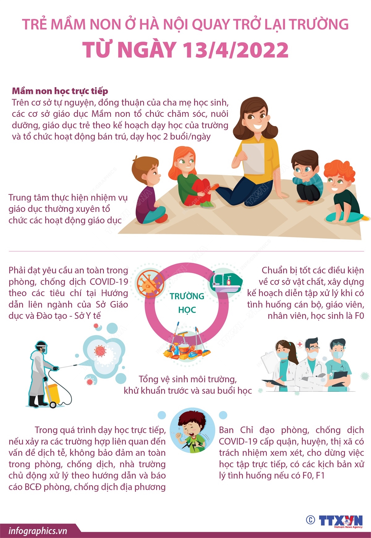 Ngày 8/4/2022, UBND thành phố Hà Nội có văn bản số 1052/UBND-KGVX gửi Sở Giáo dục và Đào tạo, Sở Y tế UBND các quận, huyện, thị xã, thống nhất về nguyên tắc theo đề xuất tại Tờ trình số 917/TTr-SGDĐT ngày 8/4/2022 của Sở Giáo dục và Đào tạo về việc cho trẻ Mầm non được trở lại trường học trực tiếp cho phép các trung tâm khác thực hiện nhiệm vụ giáo dục thường xuyên thuộc 30 quận, huyện, thị xã được tổ chức các hoạt động giáo dục sau thời gian tạm dừng đến trường để phòng, chống dịch COVID-19.