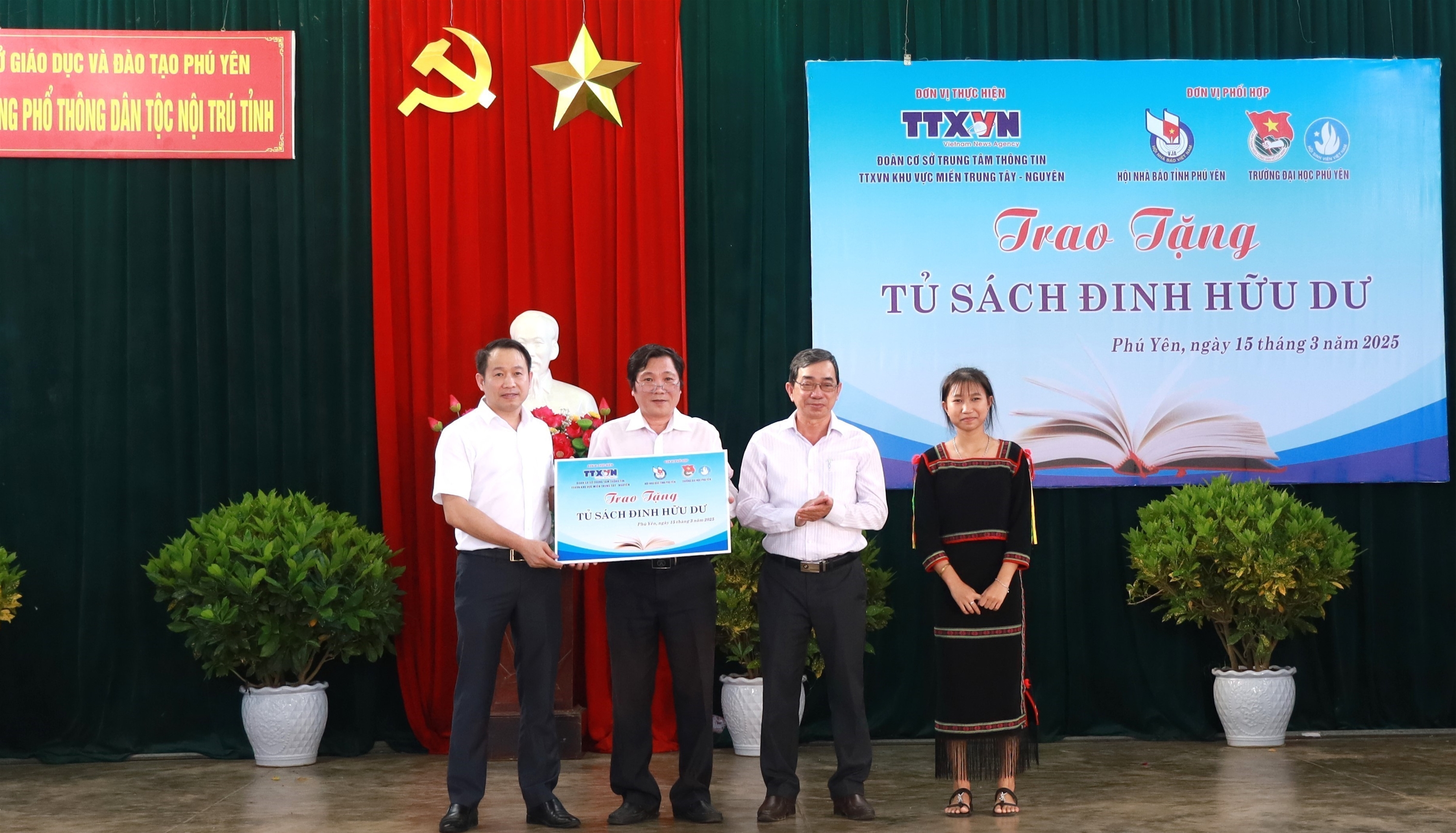 | Giám đốc Trung tâm Thông tin TTXVN khu vực miền Trung - Tây Nguyên Nguyễn Việt Dũng trao tặng Tủ sách Đinh Hữu Dư cho trường Trung học phổ thông Dân tộc nội trú tỉnh Phú Yên, ngày 15/3 |