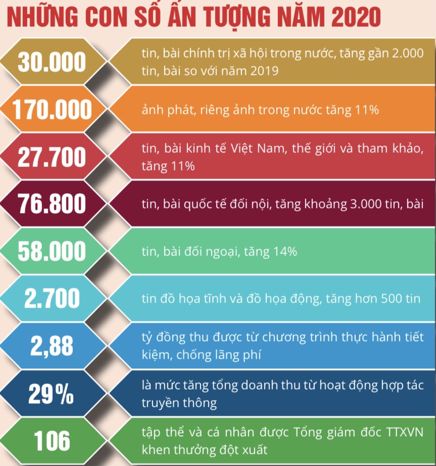 Năm 2020 cũng là năm TTXVN tổ chức thành công nhiều sự kiện quan trọng: Đại hội đảng các cấp và Đại hội đại biểu Đảng bộ TTXVN lần thứ XXVI, nhiệm kỳ 2020-2025; Đại hội thi đua yêu nước toàn ngành lần thứ V, giai đoạn 2015-2020; Đại hội Liên chi hội nhà báo TTXVN lần thứ VIII, nhiệm kỳ 2020-2025; Kỷ niệm 75 năm thành lập ngành và đón nhận Huân chương Lao động hạng Nhất; Kỷ niệm 60 năm thành lập Thông tấn xã Giải phóng và đón nhận danh hiệu Anh hùng Lực lượng vũ trang nhân dân. Qua đó, xác định những bước tiến mới của ngành trong giai đoạn tới.
