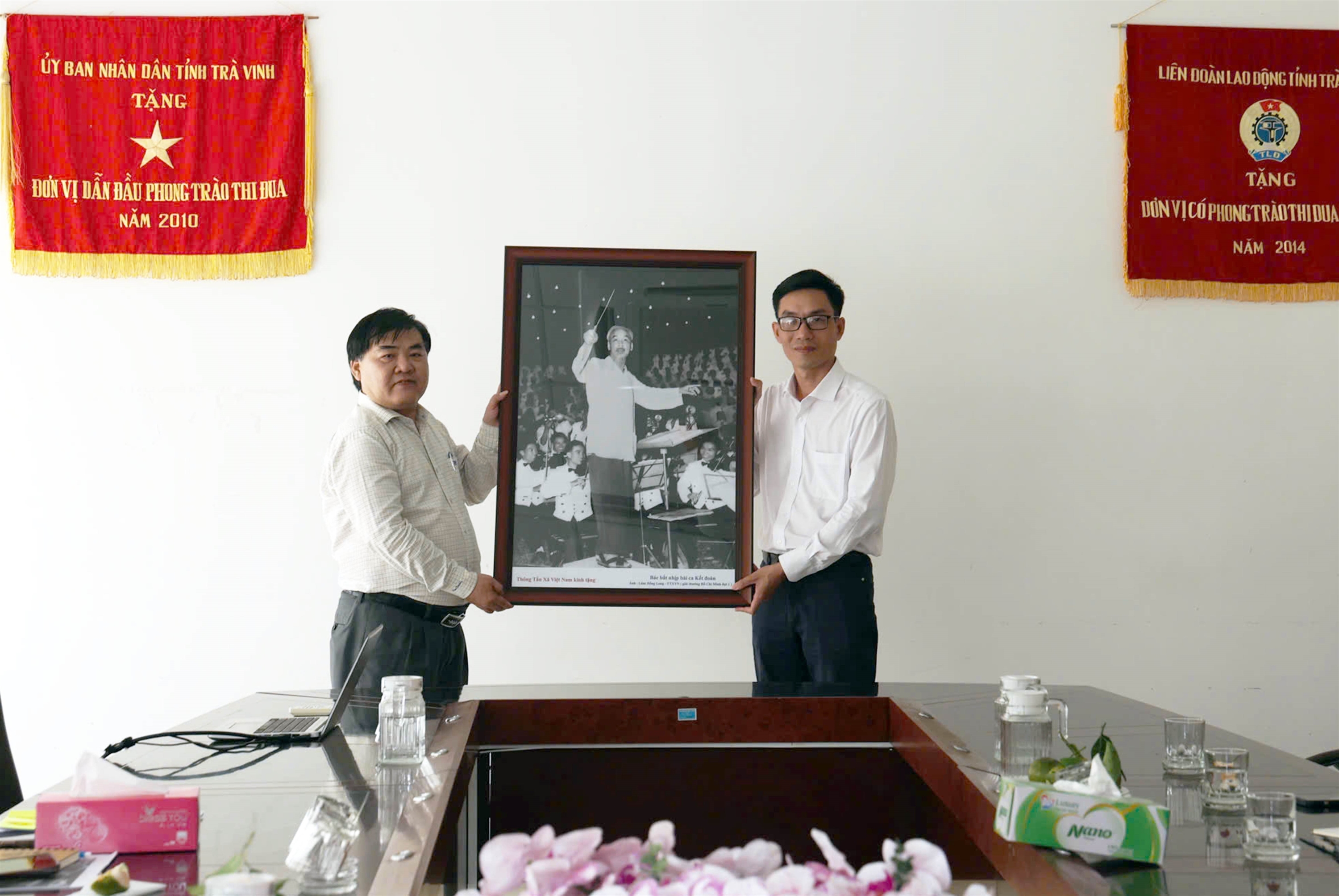 Giám đốc Trung tâm Thông tin TTXVN khu vực phía Nam Nguyễn Quốc Tuấn trao bức ảnh “Bác bắt nhịp bài ca Kết đoàn” tặng trường Đại học Trà Vinh, ngày 16/10 |