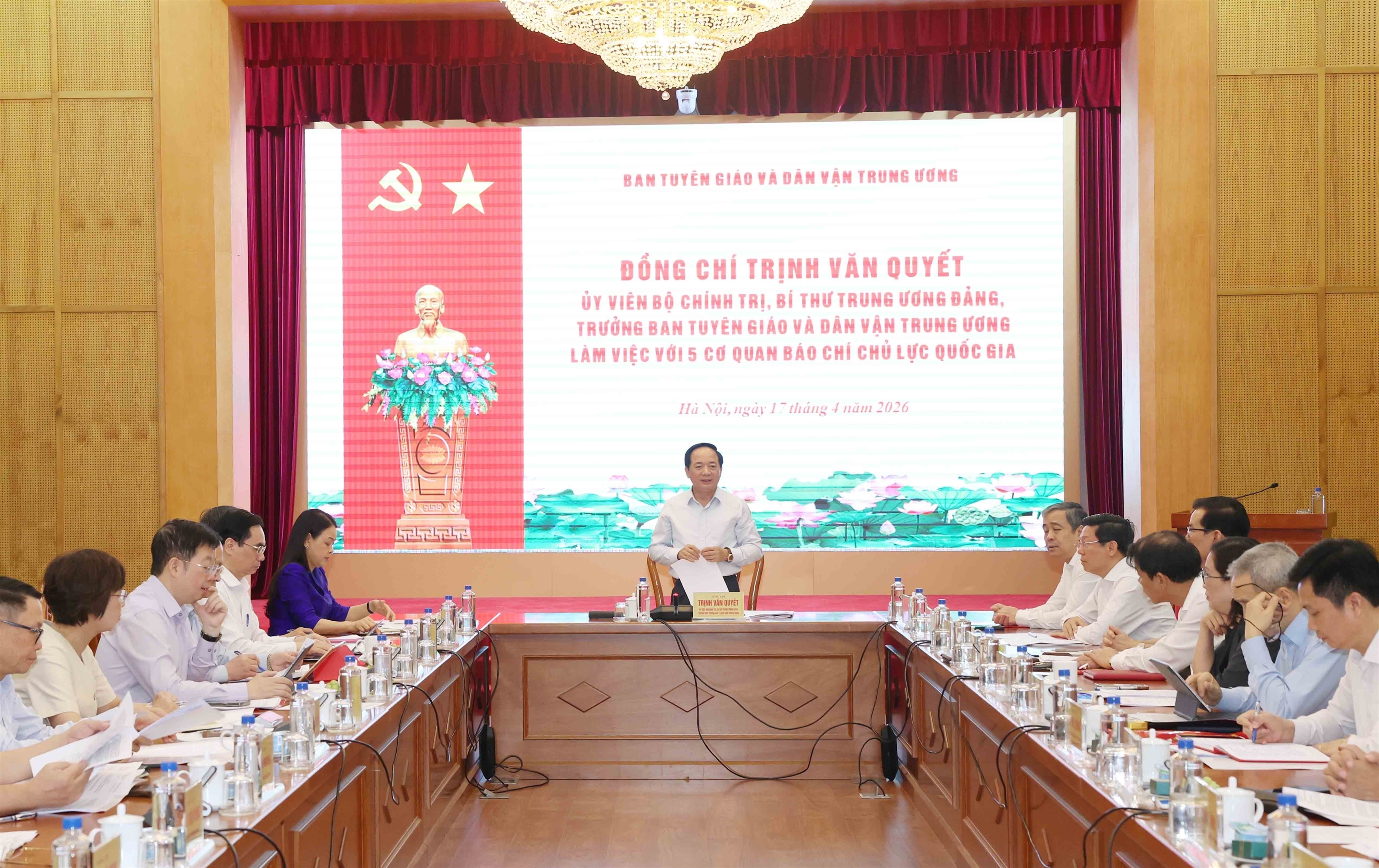 Sáng 17/4, tại Hà Nội, Ủy viên Bộ Chính trị, Bí thư Trung ương Đảng, Trưởng ban Tuyên giáo và Dân vận Trung ương Trịnh Văn Quyết làm việc với các cơ quan báo chí chủ lực quốc gia: Báo Nhân dân, Tạp chí Cộng sản, Đài Truyền hình Việt Nam, Đài Tiếng nói Việt Nam và Thông tấn xã Việt Nam (TTXVN).