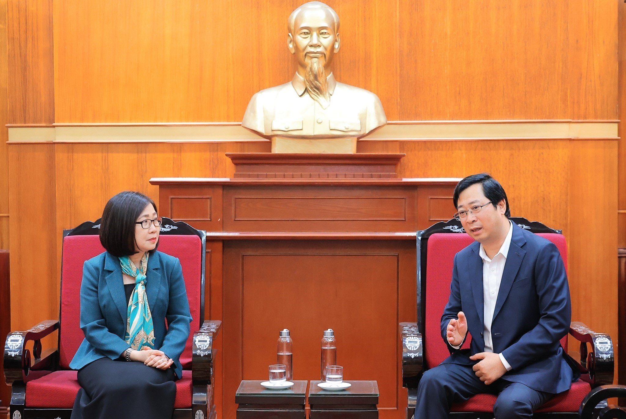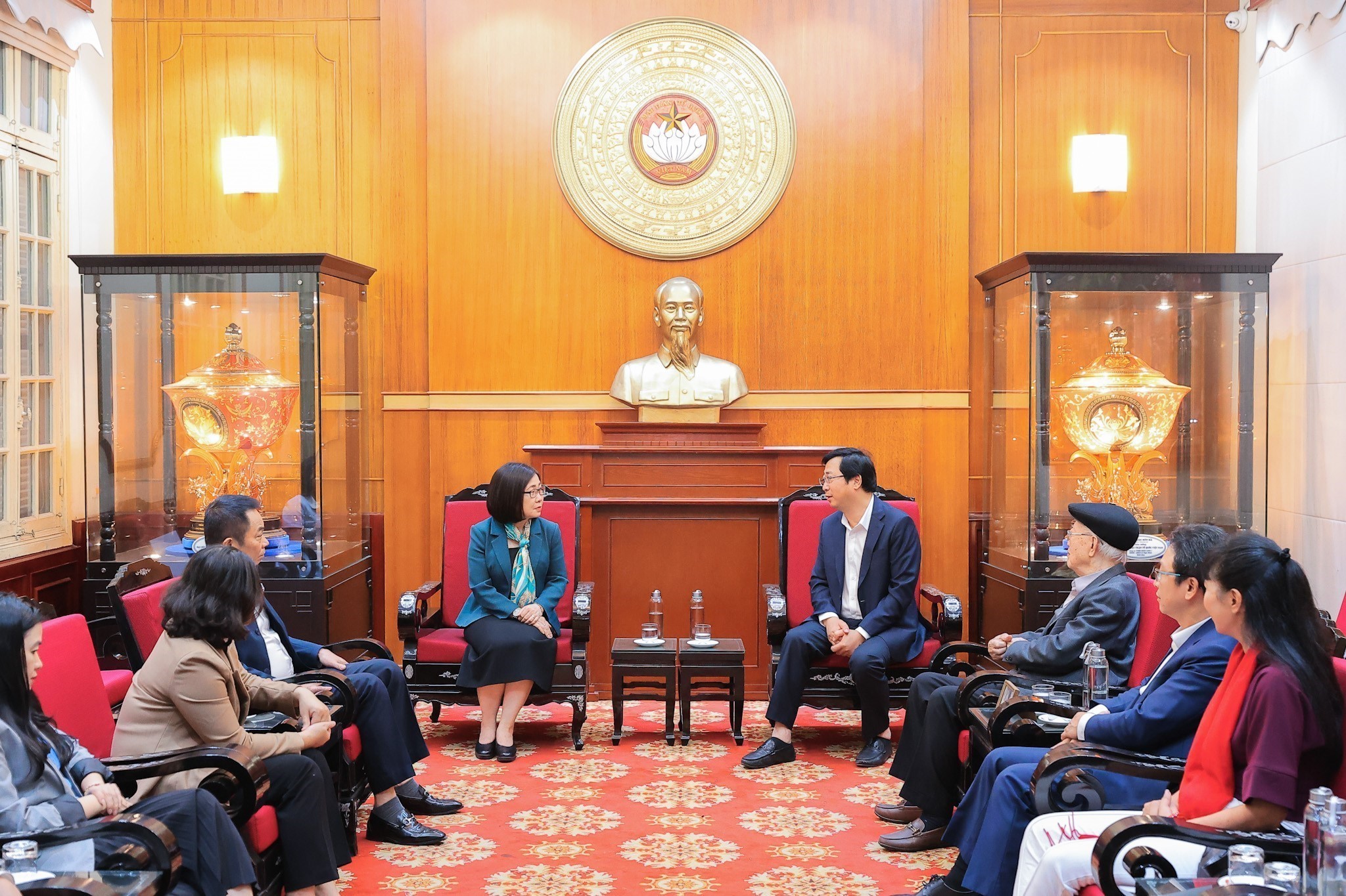| Phó tổng giám đốc TTXVN Đoàn Thị Tuyết Nhung và Trưởng Ban Công tác xã hội, Uỷ ban Trung ương Mặt trận Tổ quốc Việt Nam Cao Xuân Thạo tại buổi tiếp nhận ủng hộ, ngày 3/12 |