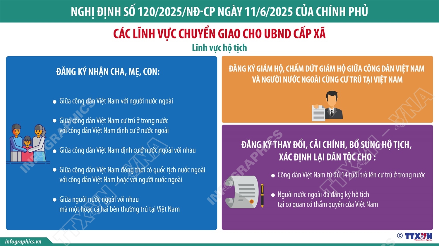 Hà Nội (TTXVN 27/6) Theo Nghị định số 120/2025/NĐ-CP ngày 11/6/2025 quy định về phân định thẩm quyền của chính quyền địa phương 02 cấp trong lĩnh vực quản lý nhà nước của Bộ Tư pháp, từ 1/7/2025, lĩnh vực hộ tịch (đăng ký khai sinh; đăng ký kết hôn; đăng ký giám hộ, chấm dứt giám hộ giữa công dân Việt Nam và người nước ngoài cùng cư trú tại Việt Nam; Đăng ký nhận cha, mẹ, con…) được chuyển giao cho UBND cấp xã.