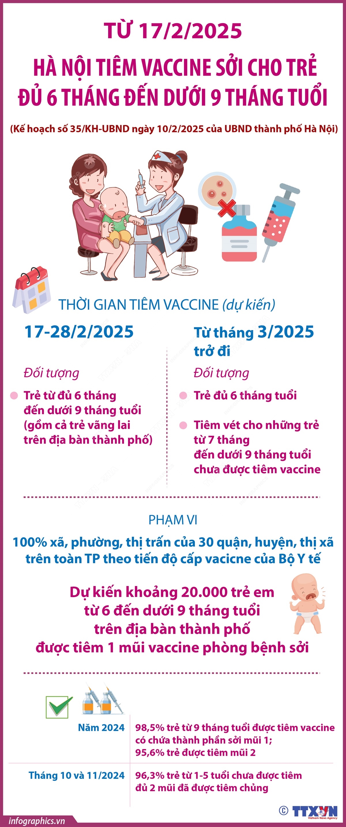 Theo Kế hoạch số 35/KH-UBND ngày 10/2/2025 của UBND TP Hà Nội, từ 17/2/2025, Hà Nội triển khai tiêm vaccine sởi cho trẻ từ đủ 6 tháng tuổi đến dưới 9 tháng tuổi. Dự kiến có khoảng 20.000 trẻ em từ 6 đến dưới 9 tháng tuổi trên địa bàn thành phố được tiêm 1 mũi vaccine phòng bệnh sởi. Nguồn vaccine được cung ứng từ Bộ Y tế.