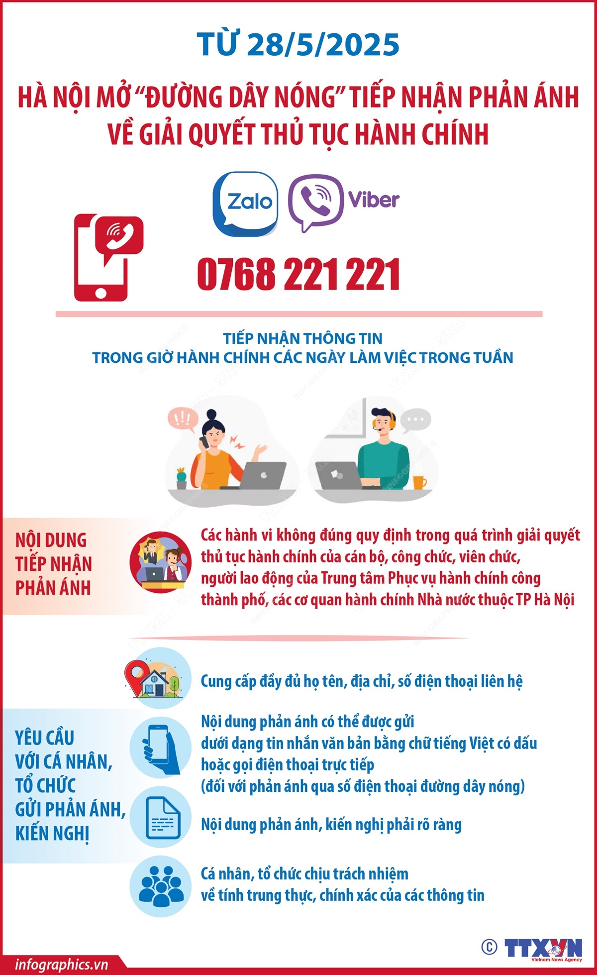 Hà Nội (TTXVN 28/5) Từ ngày 28/5/2025, Đoàn Kiểm tra, giám sát liên ngành hoạt động kiểm soát thủ tục hành chính (Hà Nội) chính thức công khai đường dây nóng tiếp nhận phản ánh, kiến nghị của người dân và tổ chức qua điện thoại, Zalo, Viber để tiếp nhận, xử lý thông tin phản ánh kiến nghị của cá nhân, tổ chức về việc tiếp nhận, giải quyết thủ tục hành chính. Theo đó, đường dây nóng do ông Cù Ngọc Trang, Giám đốc Trung tâm Phục vụ hành chính công thành phố, đồng thời là Trưởng Đoàn Kiểm tra, giám sát trực tiếp phụ trách. Người dân và tổ chức có thể phản ánh qua số điện thoại: 0768.221.221 (hỗ trợ qua cuộc gọi, Zalo, Viber) trong giờ hành chính các ngày làm việc trong tuần.
