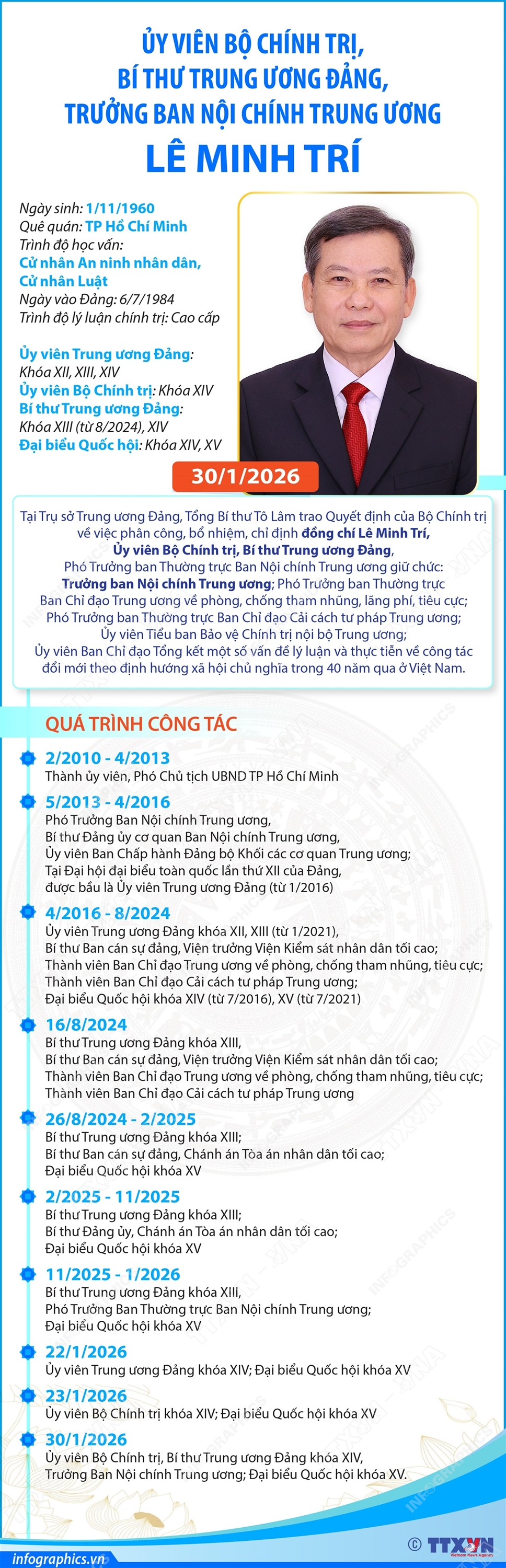 Hà Nội (TTXVN 30/1) Ngày 30/1/2026, tại Trụ sở Trung ương Đảng, Tổng Bí thư Tô Lâm chủ trì lễ công bố và trao Quyết định của Bộ Chính trị về việc phân công, bổ nhiệm, chỉ định đồng chí Lê Minh Trí, Ủy viên Bộ Chính trị, Bí thư Trung ương Đảng, Phó Trưởng ban Thường trực Ban Nội chính Trung ương giữ chức: Trưởng ban Nội chính Trung ương; Phó Trưởng ban Thường trực Ban Chỉ đạo Trung ương về phòng, chống tham nhũng, lãng phí, tiêu cực; Phó Trưởng ban Thường trực Ban Chỉ đạo Cải cách tư pháp Trung ương; Ủy viên Tiểu ban Bảo vệ Chính trị nội bộ Trung ương; Ủy viên Ban Chỉ đạo Tổng kết một số vấn đề lý luận và thực tiễn về công tác đổi mới theo định hướng xã hội chủ nghĩa trong 40 năm qua ở Việt Nam.