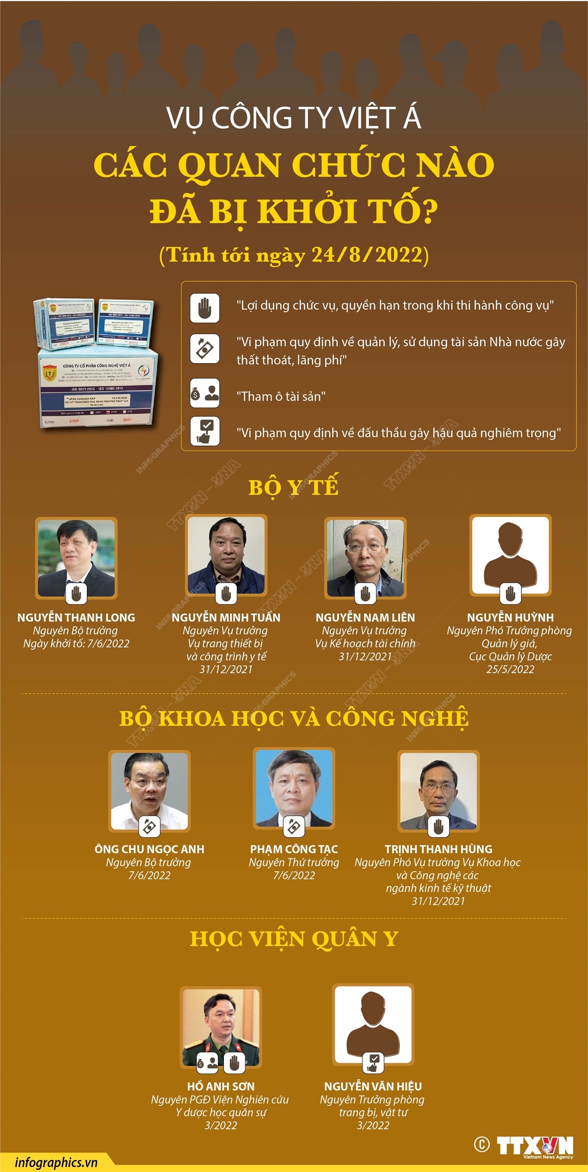Tính đến ngày 24/8/2022, Cơ quan điều tra các cấp đã khởi tố hơn 90 bị can liên quan đến vụ nâng khống giá sinh phẩm xét nghiệm COVID-19 xảy ra tại Công ty cổ phần công nghệ Việt Á (Công ty Việt Á), Trung tâm kiểm soát bệnh tật tỉnh Hải Dương (CDC Hải Dương) và các đơn vị, địa phương liên quan, trong đó có nhiều quan chức thuộc Bộ Khoa học và Công nghệ, Bộ Y tế, Học viện Quân y