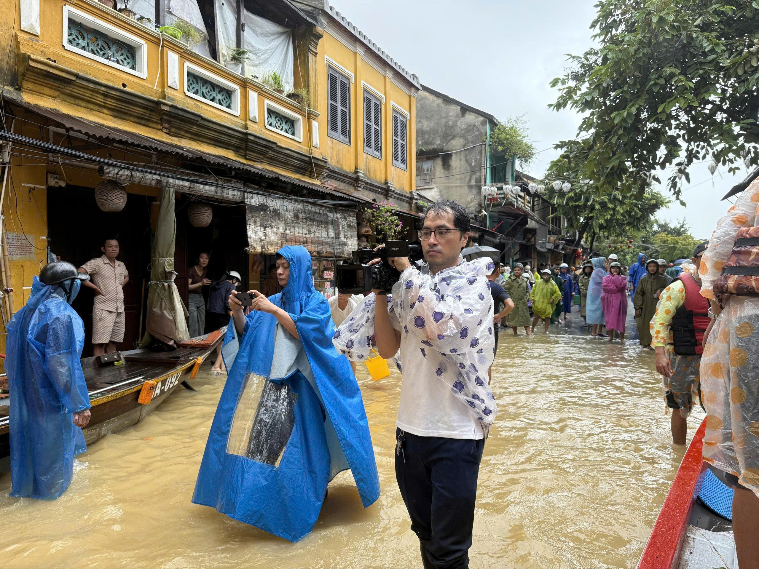 | Phóng viên CQTT TTXVN tại Đà Nẵng Trịnh Quốc Dũng ghi lại hình ảnh ngập lụt tại phố cổ Hội An, tháng 11/2025 |